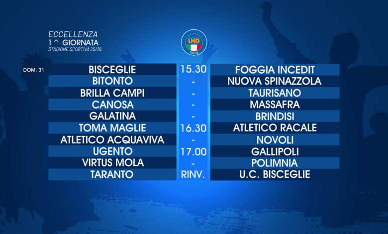 Si riparte. Ricomincia l’Eccellenza. Domani, lo start. Con lo stesso format della passata stagione: venti squadre, trentotto giornate, compresi gli immancabili turni infrasettimanali, con sei retrocessioni previste in totale e con tre chance per salire di categoria: vittoria del campionato, playoff nazionali, oltre naturalmente alla Coppa Italia Dilettanti nazionale. Si preannucia una stagione bellissima, anche per la presenza di due nobili decadute del calcio pugliese, Taranto e Brindisi: gli jonici ripartono con una nuova proprietà dopo l’addio al calcio professionistico e l’iscrizione in sovrannumero, i messapici dopo due retrocessioni consecutive. Tante le pretendenti al successo. Non giocano “a nascondino” Bisceglie e Canosa, attese entrambe da debutti casalinghi: nerazzurri, di nuovo con Di Meo in panchina, domani alle 15.30 al “Ventura” contro il Foggia Incedit, rossoblù, con la novità Modesto al timone, alla stessa ora al “San Sabino” contro il Massafra. Nuovo allenatore anche per il Bitonto, Gino Zinfollino: “battesimo” neroverde al “Sante Diomede” di Bari contro la Nuova Spinazzola, ossia contro il recente passato del neo allenatore dei bitontini. Murgiani che invece hanno affidato la guida tecnica a Fabio Di Domenico. Gioca la prima a Galatina, il Brindisi. Non gioca il Taranto, che salterà le prime due di campionato, compreso il turno infrasettimanale di giovedì prossimo: rinviata al 18 settembre la gara casalinga con l’Unione Calcio Bisceglie. E ancora, a completare il programma della giornata inaugurale i seguenti abbinamenti: Maglie-Racale, Acquaviva-Novoli, Brilla Campi-Taurisano, Ugento-Gallipoli e Virtus Mola-Polimnia.